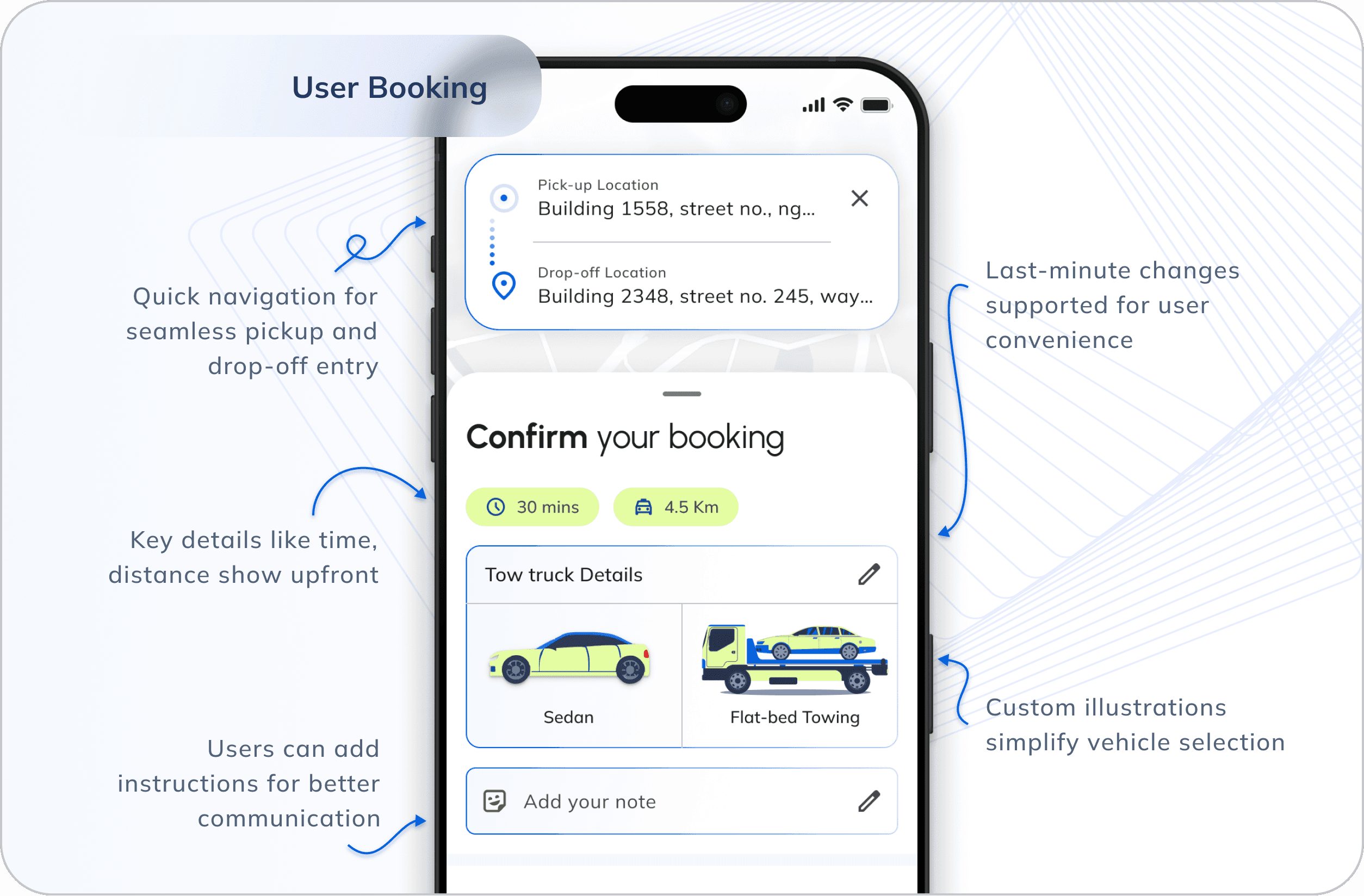Allows users to book a tow truck quickly, track progress, and complete payments effortlessly.