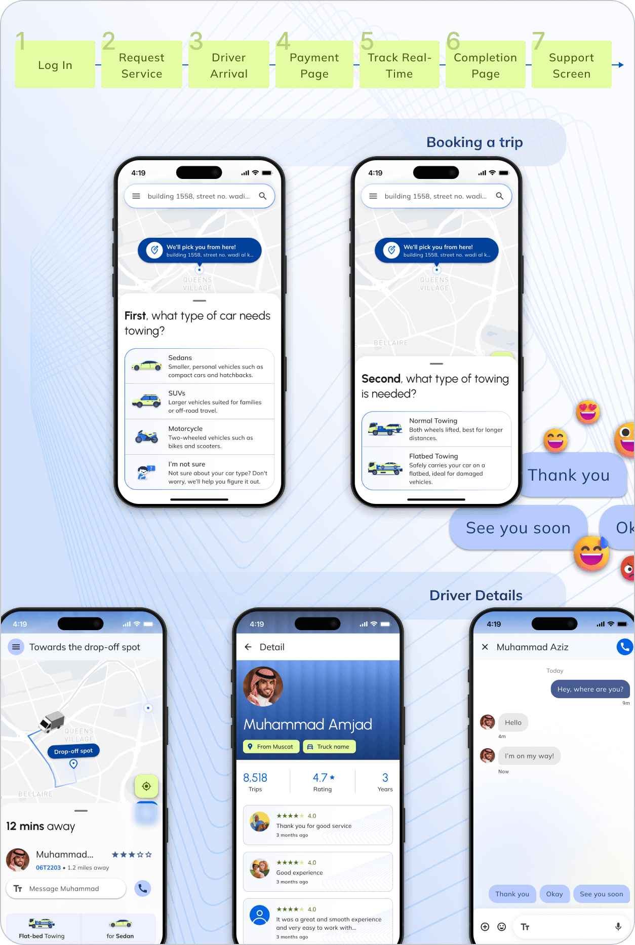 The screens are designed to support seamless interactions between users and tow truck drivers. The flow ensures clear communication, real-time tracking, and a structured process from request to completion.
